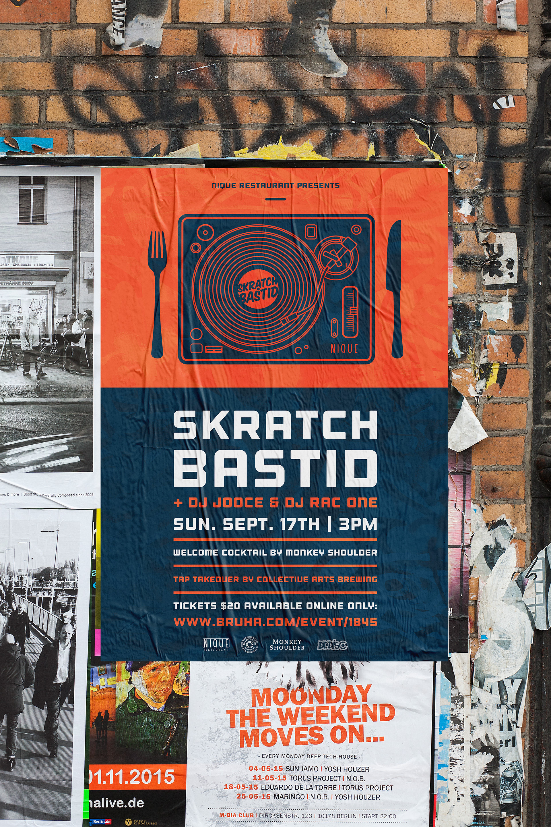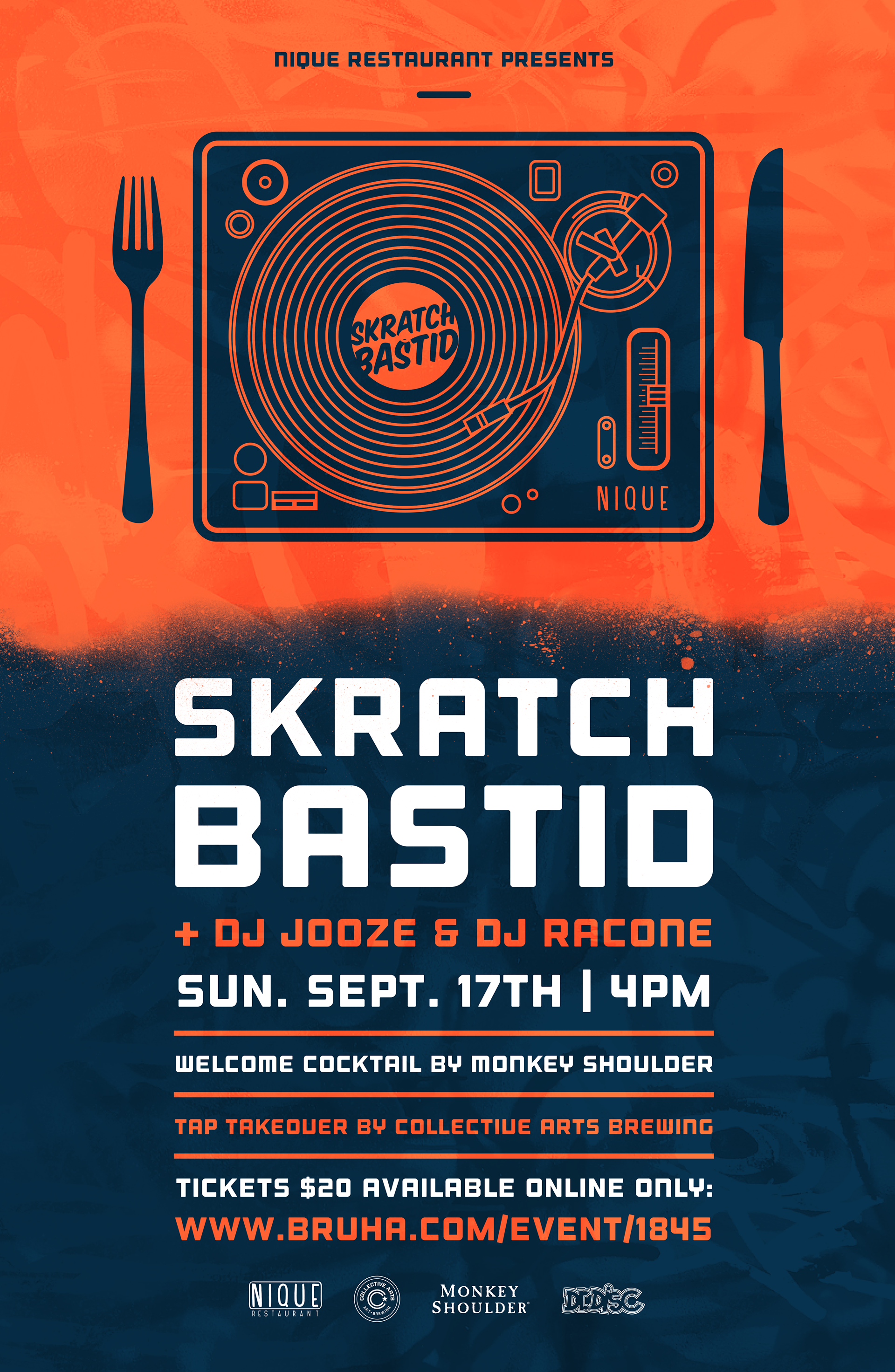A gig poster whipped up for the one and only Skratch Bastid for an open to close dance party hosted by Nique Restaurant in Hamilton, ON last year.